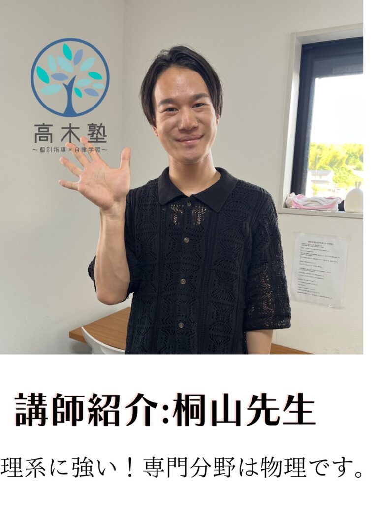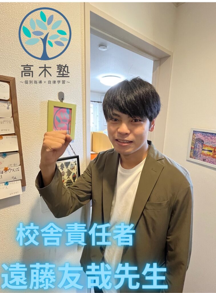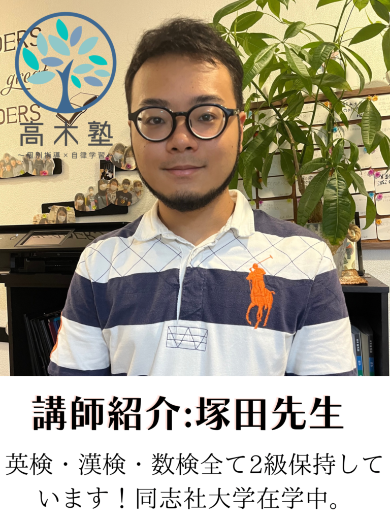 自慢のスタッフ紹介 高木塾では、実際の指導スキルである『ティーチング力』、そして生徒たちの自発性を育て、自律・自立へと導く『コーチング力』、そして生徒たちの目指す進路を叶える為に、今すべきことは何かを的確に指し示し、実行することのできる『コーディネート力』を持ったスタッフの育成に努めています。実際に働くスタッフたちの紹介をこちらでさせていただきます! 高木塾 代表:高木宏章 (関西学院大学出身) 代表 高木宏章 (関西学院大学卒業)得意科目:英語・国語 幼い頃から本を読んだり、新しいものに触れることが好きな性格でした。 大人になっても変わらず、学ぶことって楽しい!と本気で思っています♬ 新たなことを知る喜びや、それによって成長できることを少しでも子どもたちに伝えたいと思い、学習塾を営んでおります。 皆様とお会いできることを楽しみにしております。 資格検定等:中高英語教員免許・TOEIC935・実用英語技能検定(英検)1級・学習心理カウンセラー ●遠藤智哉先生 (龍谷大学理工学部卒業)得意科目:算数・数学・理科・物理 車関係やエンジニアリングに興味があり、龍谷大学の理工学部に入学しました!子どもと関わることが大好きで、高木塾では主に、英語・数学を担当します。幼い頃からサッカーをしており、バイタリティは誰にも負けません! 皆さんと授業でお会いできることを楽しみにしております♪ 平本緑先生 (大阪教育大学卒業) 得意科目:国語・算数・数学・英語 大阪教育大学卒業後、長きにわたりご自身で学習塾を経営されておりました。木津川市・奈良市の子供を中心に学習指導をされてきた先生です。わかりやすい指導とわかるまで徹底的に教える、教育に熱い思いを持った先生です。 平本先生より一言 「生徒のみなさん、はじめまして。 みなさんの中には、「何で勉強しないといけないんだろう?」と思う人がいるかもしれません。 今は面倒だと思うかもしれませんが、努力して得た知識は、荷物にならないし、誰からも奪われません。 その知識を土台に、いろいろな事を深く考えられるようになります。 頑張る皆さんの 少しでもお手伝いできたらうれしいです。 お教室で会ったら、宜しくお願いします。」 ●内薗英一郎先生 (慶應大学→東京理科大学卒業) 得意科目:理科・科学・数学・社会 内薗先生は「慶應大学」文系学部に入学後、理系を学びたいということで「東京理科大学」に入学・卒業されている先生となります。生徒の皆様にメッセージです。 「こんにちは!内薗と申します。私は子どもたちとともに楽しく学びたいと思っています。学問の楽しさや学ぶことの面白さを伝えていければと思います!ちなみに、多趣味ですのでたくさんお話ししましょうね!教室でよろしくお願いします。」 上村優心先生 京都両洋高校→文教大学 得意科目:英語・国語・古典 高校3年生までは生徒として塾に通わせていただいてましたが4月から講師として通わせていただいております上村優心(ウエムラマナト)です! 高校受験や大学受験などを終えてこれまでの自分の経験などを伝え、1人でも多くの生徒さんが勉強を好きになったり志望校への合格を掴み取れるようご指導させていただきます‼︎ 僕自身大学受験期は高木塾でご指導いただき それらがしんどい受験期のモチベーションUPに 繋がったと感じたので、これからは僕自身が定期テストや受験などのモチベーションであったり、 勉強を継続していってもらえるよう生徒さんと 日々の授業時間など大切にし励んでいきたいと思っておりますのでこれからどうぞよろしくお願いします‼︎ 塾長コメント:文面からも分かるように責任感の強い、良い先生です。塾生から講師となり、心強い存在です。生徒の皆様は沢山話してくださいね。 桐山先生 木津南中学校→龍谷大学付属平安高校→龍谷大学 得意科目:理科・物理・力学・英語・数学 桐山先生は理系が得意な先生です!5月より入職致しました。 中学生時代はとても勉強が苦手だった桐山先生。高校で勉強に目覚めて学ぶことが好きになったそうです。 勉強が好きな現在の視点と、苦手だった頃の視点、両方をもち指導できることが強みです。 塾長コメント:明るく元気な桐山先生に是非みなさん会いに来てください! 増田先生 大阪公立大学在学中 増田先生は文系理系問わず、高いレベルで指導ができる先生です。 生徒のつまづきを発見してその解決策を示すことに非常に長けています。優しく、身のある授業を展開します。 自分自身の受験生時代の経験を生かして、小学生〜高校生の指導に当たります! 松田尚樹先生(一条高校→立命館大学卒業) 松田先生は、立命館大学を卒業後、大手広告代理店にて営業職、教育関連の職業を経て現在高木塾に講師としてお越しいただきました! 得意科目は社会で、現役時代のセンター日本史は驚異の満点です。 社会の暗記方法がわからない生徒は一度松田先生に聞いてみましょう! 松田先生から一言「みんなの成績が伸びる