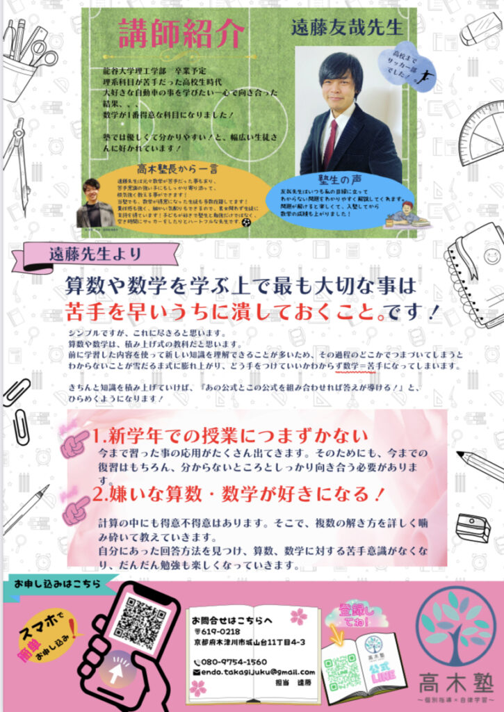 こちらの数学特訓教室では、高木塾 副教室長 遠藤先生が皆様の苦手を吹き飛ばします。