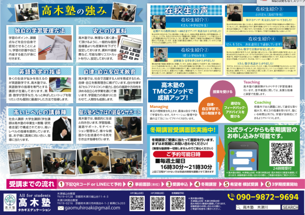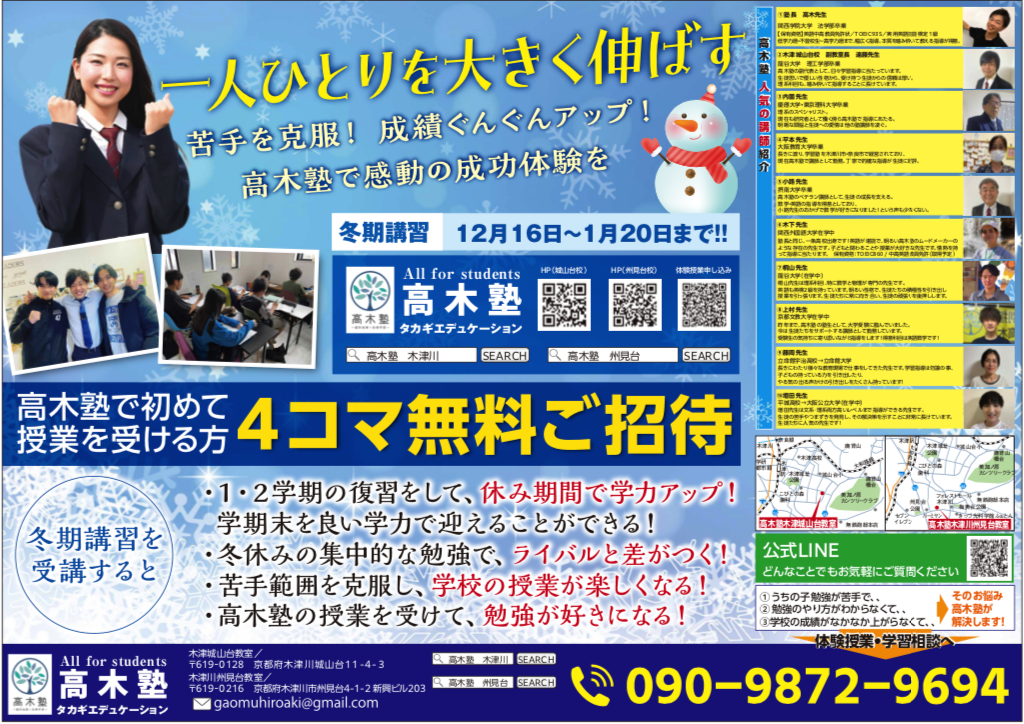 今回の冬期講習会では、受験該当学年の中3生・高3生は受験に向けての実践対策を実施いたします!また、受験が今年度にない生徒様は、2学期までの復習を徹底的に行い、得意を伸ばす!苦手克服!を実現します。高木塾木津城山台校では、初めて高木塾で授業を受けられる方に限りまして、【冬期講習4コマ 無料ご招待】をさせていただいております!