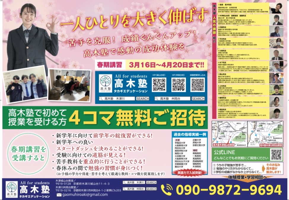いつもHPをご覧いただきまして誠にありがとうございます! 高木塾の高木です。 本日は春期講習のご案内をさせていただきます。 高木塾では3月16日〜4月20日の期間で春期講習を実施させていただきます。 学校が休みの期間中に … 続きを読む