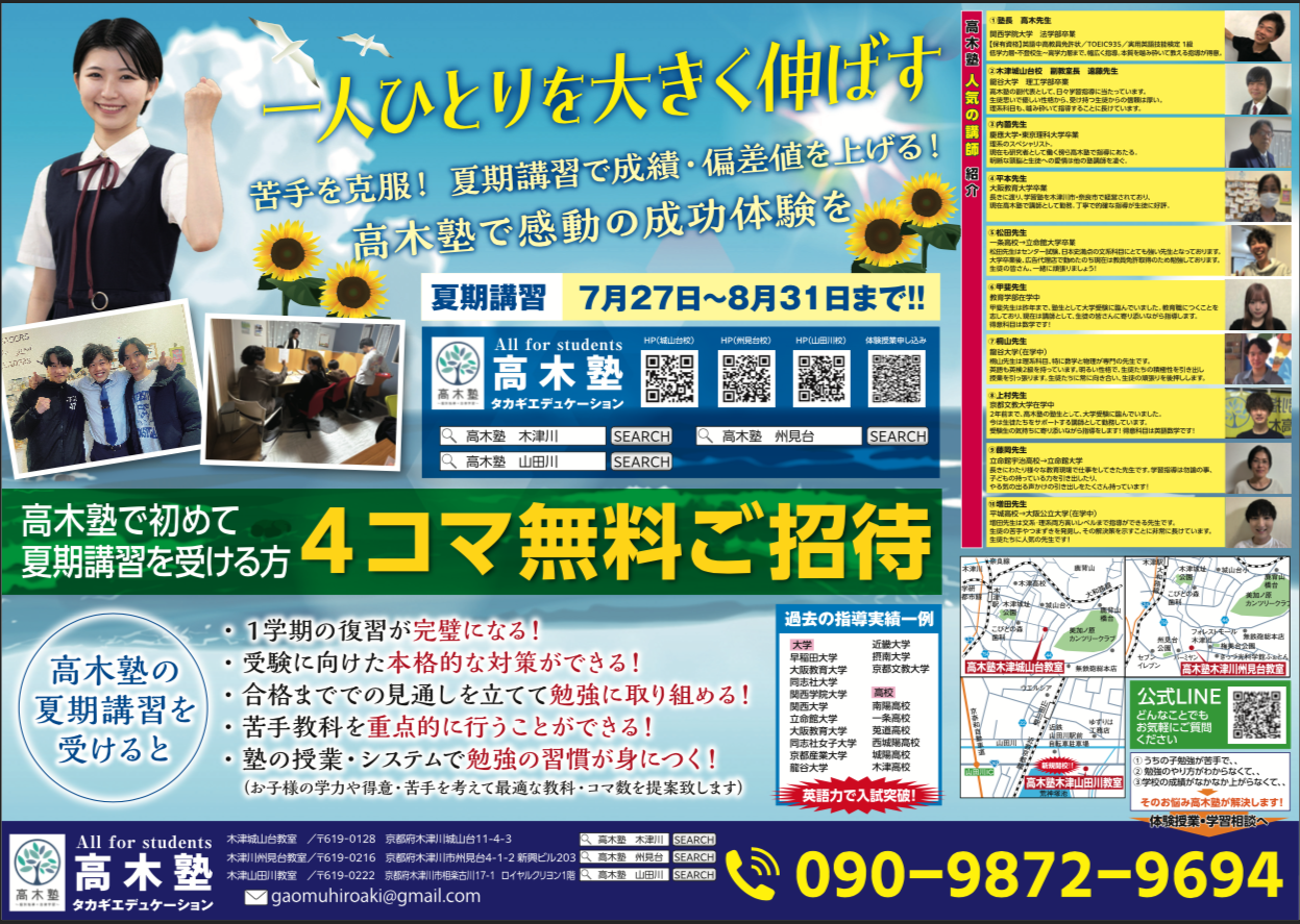 みなさんこんにちは!高木塾の高木です。 本日は少し早いかもしれませんが、本日は2024年度の夏期講習について、記載させて頂きます。 各学校では、7月末より長い長い夏休みに入ります。 受験生は勿論のこと、非受験学年生もこの … 続きを読む
