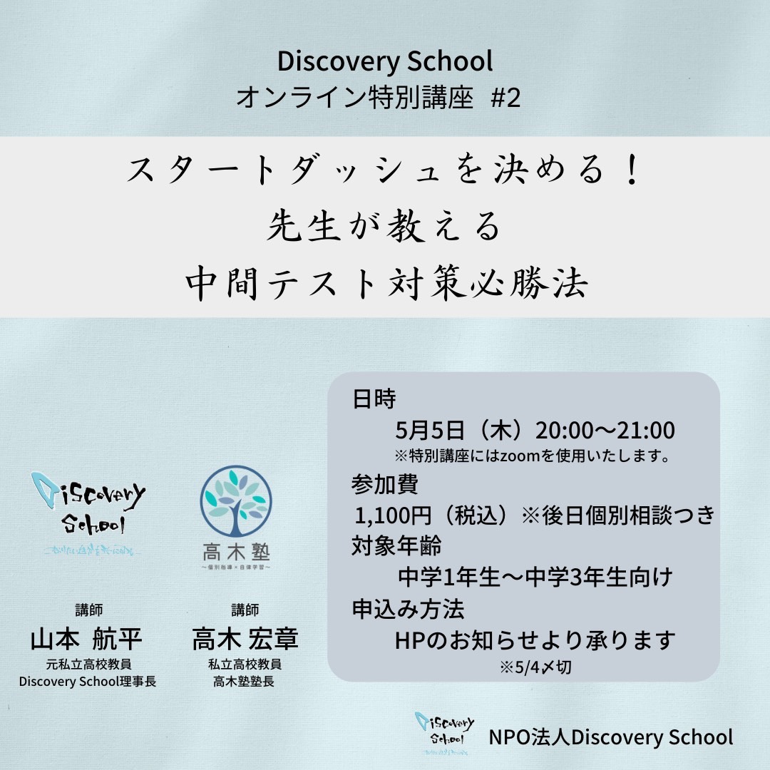 GW前、最終週となりましたがエンジンを緩めず生徒たちにはしっかりと学習をしていただこうと思っております。 本日は中学生の生徒様に向けての告知となります。 日時:5月5日 20時〜21時 対象:中学1〜3年生 中間テスト対 … 続きを読む