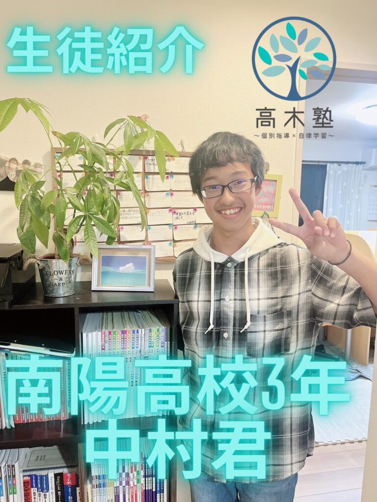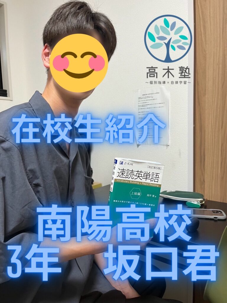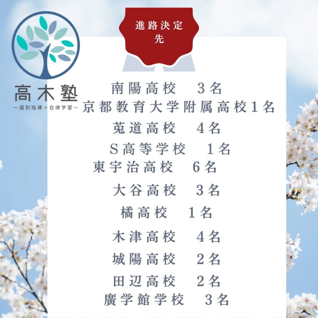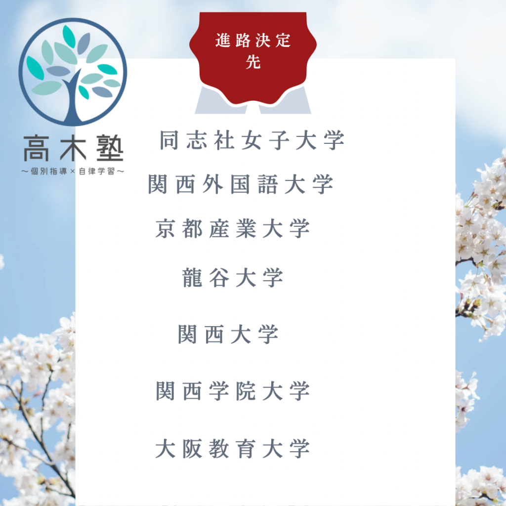 塾生の実績 高木塾 生徒の実績 高木塾には小学1年生~高校3年生まで、幅広い年齢の生徒が在籍しています。日々の努力の積み重ねで素晴らしい成果を上げる生徒達の一部をご紹介いたします! 【2024年度 高校入試合格実績】2024年度の高校入試合格実績となります。皆、それぞれによく頑張りました! 【大学入試 過去3年】過去3年間の進路実績となります。今年度は 神戸大学・大阪公立大学・奈良教育大学 など国公立志望者が多いです! 木津中学校2年生 O君●入塾後3か月で5教科370→400点オーバー!数学は60点台から今回の期末テストでは92点をマークしました。苦手教科の英語も60点台から80点まで伸びました!「高木塾では基礎を徹底して教えてくれる、分からないところもわかるまで教えてくれるので勉強していて楽しいです!」●塾に入って良かったこと今まで、曖昧な理解だった所を先生に指摘してもらい、徹底的に基礎を定着させる訓練を行ったのが、点数につながっています。また勉強する習慣もついて、毎日目標を立てて頑張れるようになりました! 左 小林君木津中学校→ 京都教育大学附属高校 合格塾に入った当初は、偏差値40 であったが、高木塾で2年間勉強して、見事京都教育大学附属高校へ合格。 右 大西君木津中学校→莵道高校合格英語数学の力をつけて、見事莵道高校合格。現在も高木塾高等部に通い、大学入試の勉強に励んでいる。 小野君 木津中学校→南陽高校 合格塾に来た当初から、基礎はできていたが応用問題への対応が苦手だったので、応用問題を徹底的に学習。英数共に高いレベルまで問題が解けるようになり、見事南陽高校合格。 高木塾に通う南陽高校サイエンスリサーチ3年生、中村君を紹介させていただきます!中村君に塾のリアルな様子や先生たちの雰囲気を語っていただきました!ぜひ最後までお読みください。①高木塾に入る前と入った後で何か変化はありましたか?高校に入学してから長文が苦手で英語を勉強することに抵抗がありました。高木塾で英語を習うようになってからはその抵抗感がなくなってきたように感じています!最初は大学入試の長文を読むのが大変でしたが、徐々に慣れてきました。②高木塾でのお気に入りポイントを教えてください!色々な先生がいらっしゃるのですが、どの先生も、自分の成長を褒めてくれるところです!褒められると勉強のモチベーションが落ちにくくく、集中力や、やる気を落とさず勉強ができる環境になっているところはすごく良いなと感じています!また、州見台の自習室をいつでも高校生は使えるので授業+自習で学習できます。テスト前など家で勉強がはかどらない時は授業のない日も塾に行って長い時間勉強しています!③高校3年生ということで受験への意気込みをお願いします!私は国公立大学進学を目指しています。これからもっと力をつけてどんな問題からも逃げずにチャレンジしていきたいです。志望校合格に向けて臥薪嘗胆で頑張ります! 南陽高校 サイエンスリサーチ 3年生 坂口君です! 坂口君は大阪公立大学を目指して勉強中です。 坂口君に塾のことを語っていただきました!是非最後までお読みください! ①入塾のきっかけは? 大学受験に当たって、学習環境が欲しかったということ、そして一人で難しいところを教えてほしかったという理由で入塾しました。また、同じ学校から通っている人が複数いたのでそれも大きかったです。 ②入ってから頑張っていることはなんですか? 強化でいうと英語に力を入れています。始めた頃よりも知識も増えました。英文も読めるようになってきましたが、これからは本番に向けてスピードも意識して学習していきたいと思います。 また、城山台校・州見台校の両方に行って授業時間以外もかなりの時間自習しています。 模試の結果に一喜一憂する時もありますが、それでも一生懸命取り組んでいます。 ③受験に向けての意気込みをお願いします! 今できることを徹底的に行い、合格を目指したいと思います!頑張ります! 【塾長コメント】 聡明なだけでなく、思いやりのあるとても良い生徒です。 日曜日祝日問わず、自習室に来ている姿を見ると、本当にこちらもできることはなんでもしてあげようと思います! 英語偏差値を65以上にして、この夏で合格に近づこう! 高木 木津中学校1年生 I君 高木塾に小学5年生から通っていただいている I君 英語・国語・数学を先取り学習を実施しながら基礎に忠実に学習してきました。 結果、中学入学後初のテストで 英語96点・数学99点 をマークすることができました!!(5科目460点)